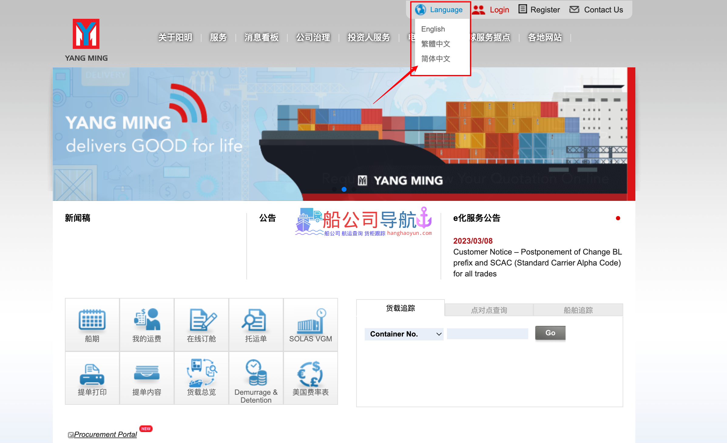 YML船公司阳明海运官网: https://www.yangming.com/index.aspx